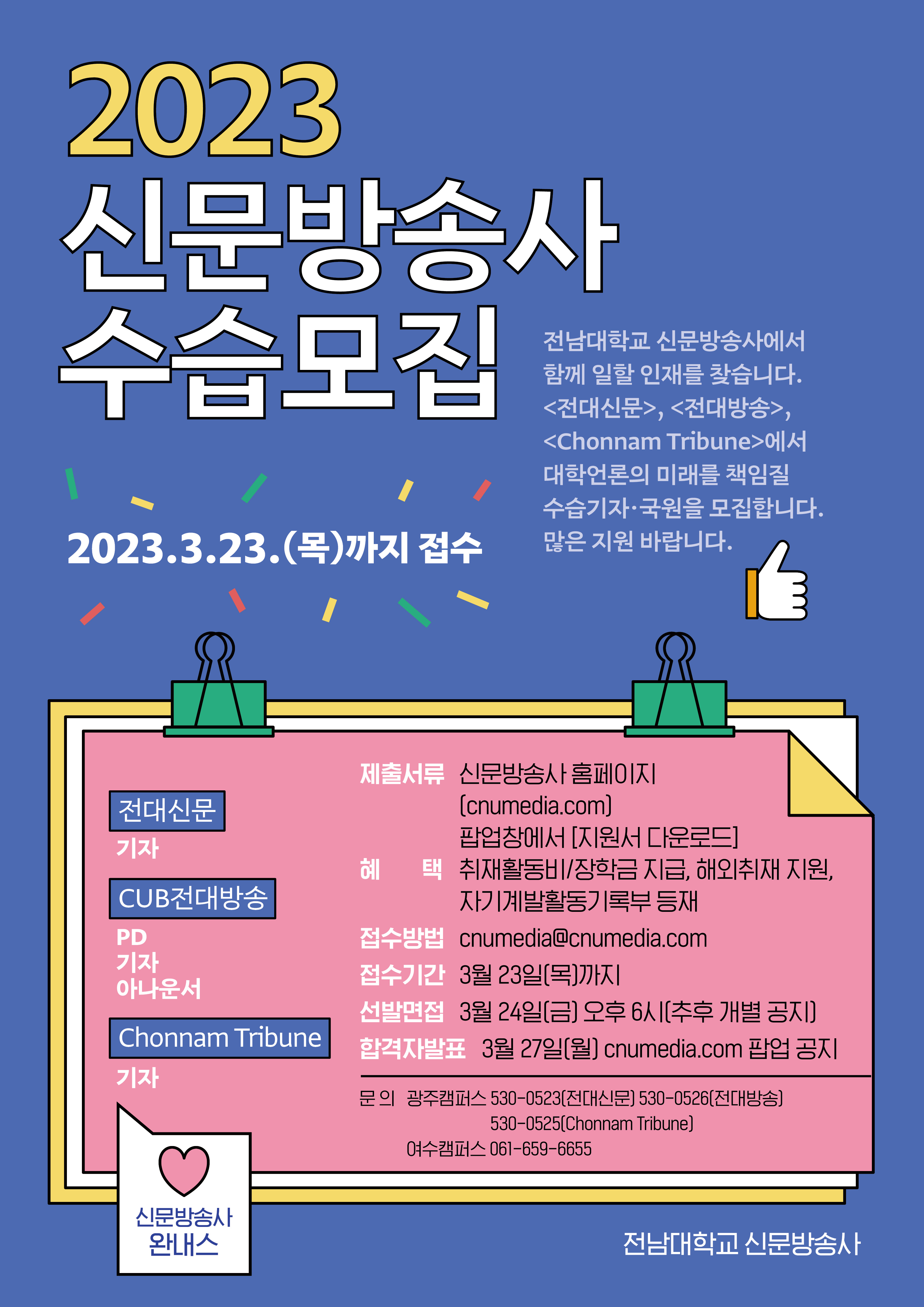○ 합격자 발표: 2023.3.27. 신문방송사 홈페이지/전대신문 1649호(2023.4.3.자 발행)