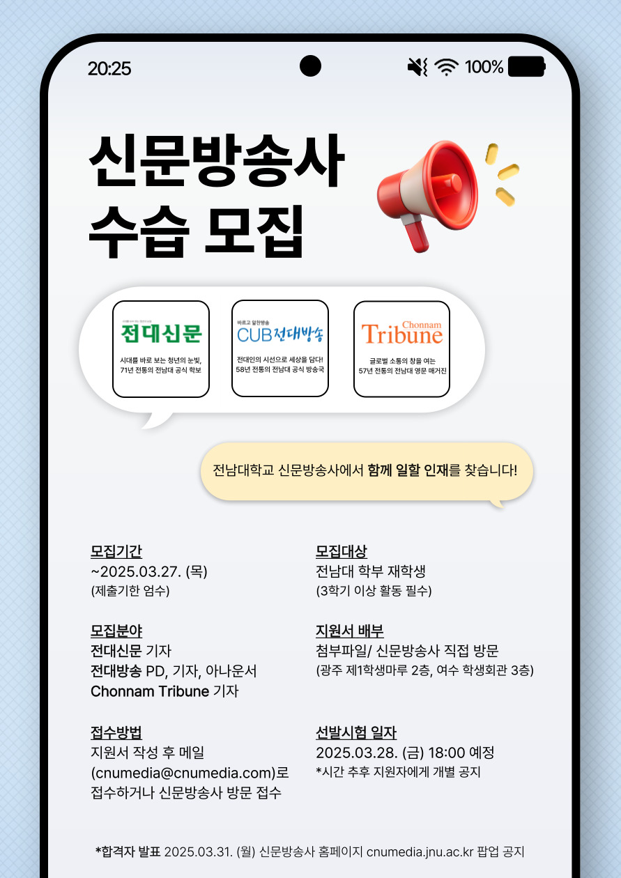 ○ 합격자 발표: 2025. 3. 31.(월) 신문방송사 홈페이지 / 전대신문 (4.14자) 발표