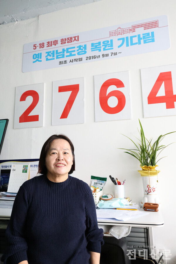 ‘옛 전남도청 지킴이’(지킴이)로 활동하고 있는 추혜성(67)씨는 2,764일째(4월 2일 기준) 구도청의 완전한 복원만을 기다리고 있다.