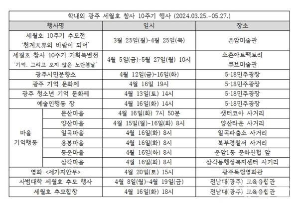 우리 대학을 포함한 광주 전역에서 세월호 참사 10주기를 기리는 여러 추모행사가 열린다.