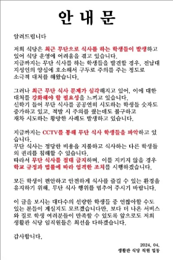 김대진 BTL 식당 관계자는 “최근에 무단으로 들어와 식사 하려는 학생을 잡은 적이 있다”며 “이후에 같은 학생이 또 무단으로 들어오다 걸려 결국 경찰에 신고했다”고 말했다. 이후 BTL 식당 측은 생활관 행정실과 의논해 지난달 무단 식사를 금지하는 안내문을 붙였다. 그러나 안내문을 붙인 후에도 무단취식 문제는 여전하다. 김 관계자는 “직접 확인하지 못해도 학생들이 와서 건의하기도 한다”며 “안내문을 붙인 후에 수가 줄었지만 여전히 무단취식하는 사람들이 있다”고 말했다.