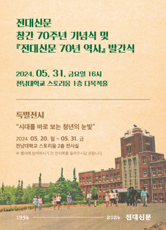 <전대신문>이 창간 70주년을 맞아 오는 20일부터 31일까지 우리 대학 스토리움 2층 전시실에서 전시를 진행한다. 오는 31일 오후 4시에는 스토리움 1층 다목적홀에서 창간 70주년 기념식과 <전대신문 70년 역사> 발간식이 동시에 진행된다. 행사에는 누구나 참여할 수 있다.