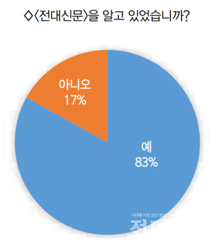 21년 전과 마찬가지로 <전대신문>에 대한 학내 관심도는 그리 높지 않다. 인식조사 결과 응답자의 42.3%(85명)가 <전대신문>을 모르거나 한 번도 읽어보지 않았다. 1310호(2003.6.9. 발행)에 실린 매체 조사 결과를 보면 전체 응답자 391명 중 53.7%가 ‘<전대신문>을 거의 집어 들지 않는 것’으로 나타났다. 이러한 결과를 통해 우리 대학 학생들의 학내 언론에 대한 관심이 여전히 적음을 알 수 있다.