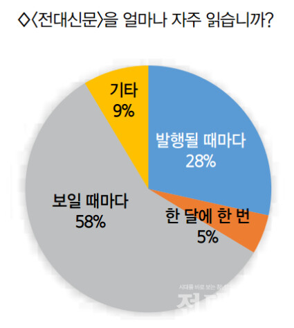반면 <전대신문>이 발행 될 때마다 꾸준히 읽는 독자들도 있다. ‘<전대신문>을 얼마나 자주 읽습니까?’라는 질문에 ‘발행될 때마다’ 챙겨 읽는다는 응답자가 28%(33명)로 두 번째로 많았다. ‘보일 때마다’ 읽는다고 한 응답자는 58%(67명)로 가장 높았다.