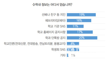 인식조사를 분석한 결과 우리 대학 구성원들이 <전대신문>을 잘 찾지 않는 또 다른 이유 중 하나는 학내 정보를 학내 언론이 아닌 다른 곳에서 얻기 때문이다. ‘학내언론(△<전대신문> △전대방송 △전남트리뷴 △용봉교지편집위원회)’에서 정보를 얻는 비율은 가장 낮은 8%였다. 응답자의 대다수는 학내 정보를 ‘학과 단톡방 공지’(20%)에서 얻고 있었다. 그 뒤로는 △‘학교 홈페이지 공지사항’(17%) △‘에브리타임(에타)’(16%) △‘학교 기관 SNS’(11%) △‘학생회 SNS’(8%)가 있었다.