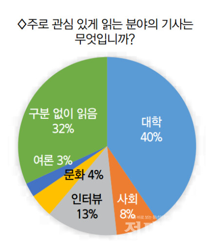 그런 특징을 반영하듯 응답자들은 <전대신문>에서 ‘대학’(40%)과 관련된 기사를 가장 관심 있게 본다. 이는 21년 전 매체 조사에서도 마찬가지였다. 당시 학생들이 <전대신문>에서 가장 관심 있게 보는 면은 ‘대학면’(36.1%)이 가장 많았고 그 뒤로 ‘사회면’(22.5%) ‘문화면’ (18.9%)순이었다.