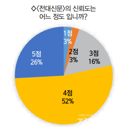 숫자로 보면 이번 인식조사 결과 <전대신문>의 신뢰도는 5점 만점에 평균 4점이다. 그 이유로는 <전대신문>이 대학의 부속 기관이라는 공신력이 있기 때문에 신뢰도가 높다는 의견이 주류였다. ‘<전대신문>의 신뢰도는 어느 정도입니까?’ 라는 질문에 4점을 준 응답자는 “대학 이름을 걸고 운영하기 때문에 신뢰가 간다”고 답했다. 또 다른 응답자는 “학교를 대표하는 신문인만큼 신뢰성이 있어 보인다”며 “기사의 저자들이 항상 적혀있어서” 신뢰가 간다고 답변했다.