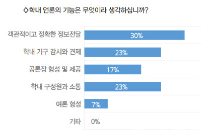 한 응답자는 “주변에서만 해도 학내에 언론사가 있다는 것 자체를 아는 사람이 적다”며 “그 점이 아쉽다”고 답했다. 또 다른 응답자는 “더 많은 독자층을 끌어내기 위해서는 교내 다양한 소식들을 담아내야 될 것 같다”고 말했다.