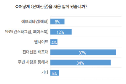 배포대 위치를 잘 모르는 응답자가 많았지만, <전대신문>을 처음 알게 된 경로가 배포대(37%)인 경우도 많았다. 그렇기에 <전대신문>을 더 많은 사람에게 읽히게 하려면 배포대를 더 잘 보이게끔 하거나, 배포대 위치가 어디인지 알려줬으면 좋겠다는 의견이 많았다. 한 응답자는 “<전대신문>의 접근성이 떨어진다”며 “대부분의 시간을 보내는 기숙사에서 <전대신문>을 접한 적이 없다”고 답했다. 또 다른 응답자도 “<전대신문>이 언제 어디서 어떻게 배포되는지 학생들이 잘 모르고 있다”며 “취재 뿐 아니라 홍보도 신문의 중요 기능 중 하나라고 생각한다”고 답했다.
