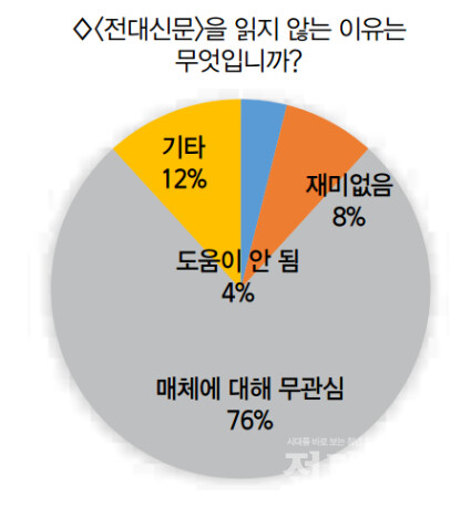 학내 구성원들은 <전대신문>을 어디서 어떻게 읽는지조차 모르는 경우가 많았다. 한 응답자는 “<전대신문>을 어디서 읽는지 모른다”며 “신문이 언제 발행되는지 조차 잘 모른다”고 답했다. 그 밖에도 “<전대신문>을 어디서 구하는지 모른다” “읽을 수 있는 방법을 알 수 없다”는 답이 많았다. 매체에 관한 무관심 이외에는 ‘재미없다’(8%) ‘도움이 되지 않는다’(4%) 순으로 응답이 높았다.