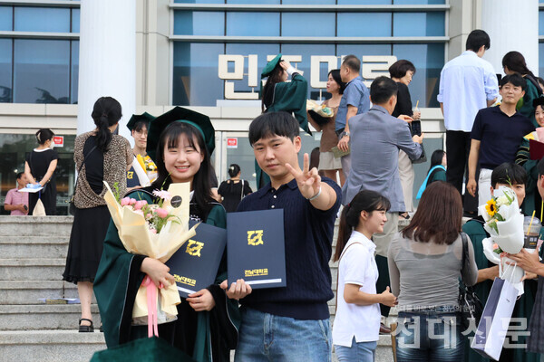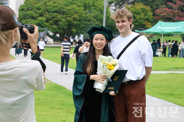 26일 후기 학위수여식에 참여한 졸업생이 5·18광장(봉지)에서 학위복을 입고 포즈를 취하고 있다. 제72회 2023학년도 후기 학위수여식이 이번달 26일 민주마루에서 열렸다. 이날 후기 학위수여식에는 학사 3,132명, 석사 775명, 박사 151명, 명예 학사 2명으로 총 4,060명이 학위를 받았다.