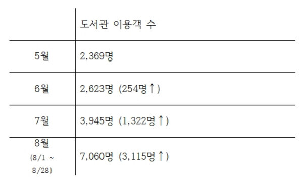 리모델링 끝나고 지난 5월 7일 개관한 도서관의 5월 방문자 수는 학생과 지역민을 모두 합쳐 2,369명이었다. 다음달인 6월에는 200여명이 증가해 2,623명을 기록했다. 방학인 지난 7월에는 학생 수는 줄어들었으나, 지역민 이용률은 훨씬 늘어나 이전보다 1,000명 이상 많은 총 3,945명이 도서관을 방문했다. 지난달 1일부터 28일까지는 7,060명이 도서관을 방문했다. 일주일 중 휴관일 없이 오전 6시부터 자정까지 이용할 수 있는 도서관 열람실은 평일 저녁 시간대와 주말에 이용률이 제일 높았다.
