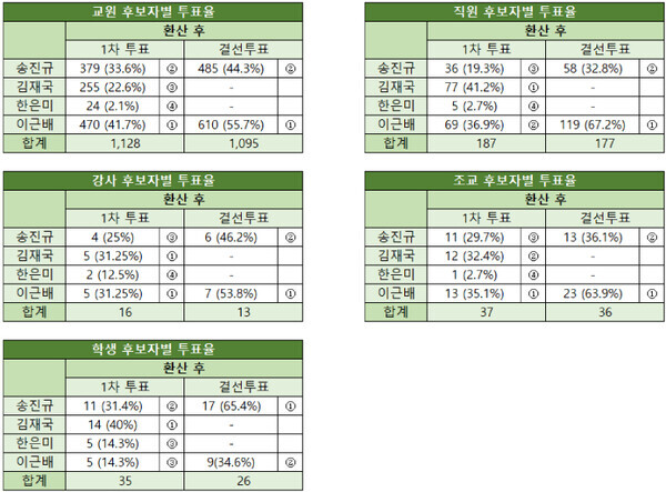 구성원별 1차 투표 투표율은 △교원 94.55% △조교 93.9% △직원 92.67% △강사 56.21% △학생 31.44%다. 결선투표 투표율은 △교원 97.07% △조교 95.67% △직원 94.49% △강사 84.22% △학생 70.29%다.