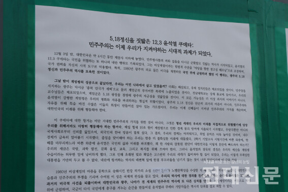 지난 6일 최씨도 ‘5·18정신을 짓밟은 12·3 윤석열 쿠데타’라는 제목의 대자보를 자신의 인스타그램 계정과 학내에 게시했다. 최씨는 “우리 대학은 비상계엄에 관한 큰 아픔이 있는 학교다”며 “지난 민주화 선열들에 대해 한 점 부끄러움을 남기지 않기 위해 실명으로 선언문을 발표했다”고 이유를 밝혔다.