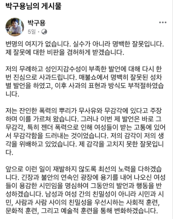 박 교수는 11일 페이스북을 통해 "잘못을 명백히 인정한다"며 사과문을 올렸다. 그는 “다시는 이런 일이 일어나지 않도록 남성과 여성이 아닌, 시민과 시민의 친밀성을 우선하도록 훈련하겠다”고 말했다.