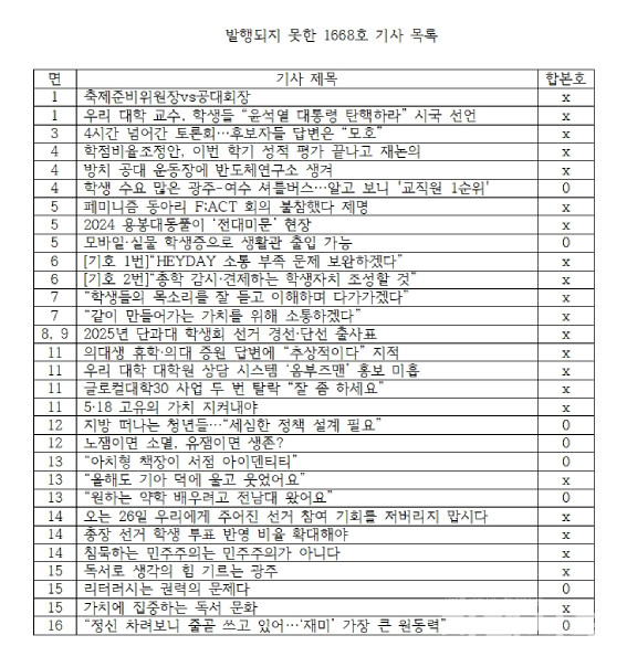 갈등이 깊어진 건 1668호를 제작하면서였다. 1668호는 4년 만의 경선인 총학생회 선거 내용을 지면에 담기 위해 발행일을 한 주 미룬 총학생회 선거 특집호였다. 기자들은 예년에는 없던 2025학년도 총학생회 선거 경선토론회 기사를 실어야 한다고 판단했다. 그러나 편집위원은 경선토론회 취재가 ‘금요일 오후 7시’라 지면에 넣을 수 없다고 판단했다. 편집국장이 경선토론회를 지면에서 다뤄야 하는 이유를 재차 설명하자 ‘원칙’을 지키지 않을 시 신문을 발행하지 않겠다고 말했다.