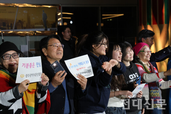 한강 작가의 노벨문학상 수상을 축하하기 위해 새벽 늦은 시간 300여명의 시민들이 광주광역시청(시청)에 모였다. 시청 앞 광장에는 은하수가 쏟아져 내렸다. ‘빛고을 무지개’가 한강 작가의 노벨문학상 수상을 기념해 1,200개 조명으로 보여준 은하수였다.
