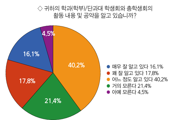 ‘귀하의 학과·학부/단과대 학생회와 총학생회의 활동 내용 및 공약을 알고 있습니까?’라는 질문에는 △어느 정도 알고 있다(40.2%) △거의 모른다(21.4%) △꽤 잘 알고 있다(17.8%) △매우 잘 알고 있다(16.1%) △아예 모른다(4.5%) 순으로 답변이 나왔다. 설문 응답자 중 학생회 활동 경험이 있는 학생이 절반가량인 것을 고려했을 때 학생회 활동 내용 및 공약을 잘 알고 있는 일반 학생이 많지 않음을 알 수 있다.