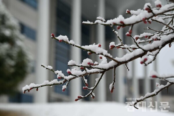 지난 18일 우리 대학 민주마루 앞 홍매화가 눈을 맞고 있는 모습. 때 아닌 폭설로 인해 홍매화 대신 눈꽃이 폈다. 지난 21일 농업실습교육원 조경관리팀 홍매화 담당자는 “보통 양력 3월 20일 경 홍매화가 피는데, 꽃이 피려할 때 추위가 찾아와 더 늦어지는 것 같다”며 “다른 품종 보다 홍매가 늦게 피는 편이다”고 말했다. 이어 “날씨나 일조량에 따라 개화 시기가 달라지지만 차이가 많이 나도 일주일”이라며 “이제 곧 꽃이 필 것”이라고 말했다.