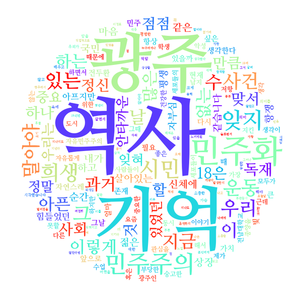 응답자들은 5‧18을 기억해야 하는 중요한 역사로 생각하기에 잊혀가고 있는 현실을 비판했다. ‘역사’는 총 42번 쓰여 100개의 답변 내용 중 가장 많이 사용된 단어였다. 이와 함께 ‘기억’이 28번, ‘잊지’ ‘말아야’, ‘잊혀지는’ 등 ‘잊다’의 활용형이 23번 사용돼 높은 빈도를 보였다.