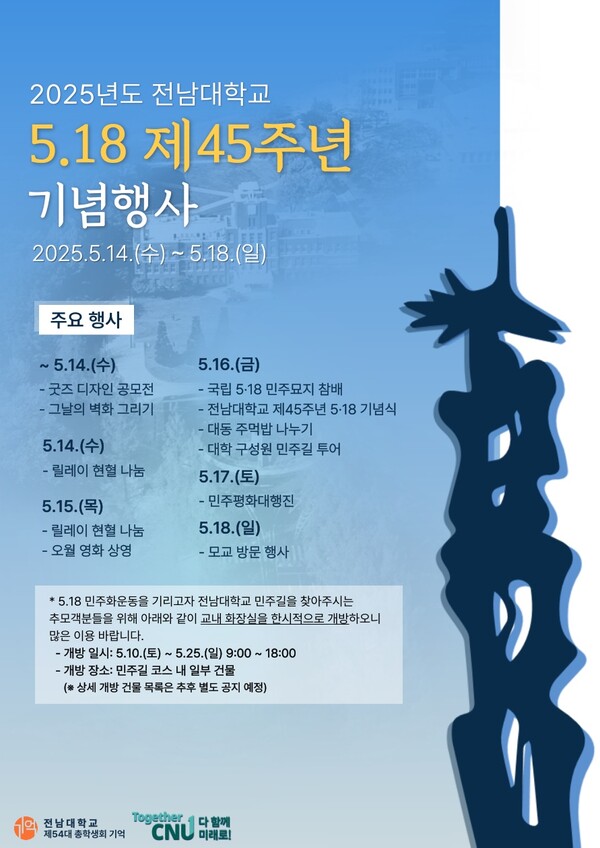 5·18민중항쟁(5·18) 45주년을 맞아 우리 대학 △학생처 △총학생회 △총동아리연합회 △5·18연구소 등 다양한 단위에서 행사를 준비하고 있다.