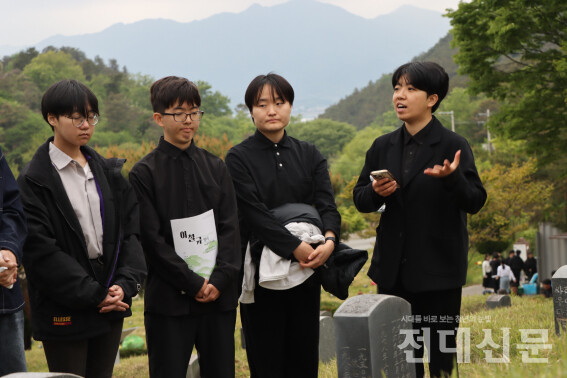 국립5ㆍ18민주묘지에 방문한 조선대 교지편집위원회가 지난 6일 위르겐 힌츠페터 기념비 앞에서 관련 설명을 듣고 있다.