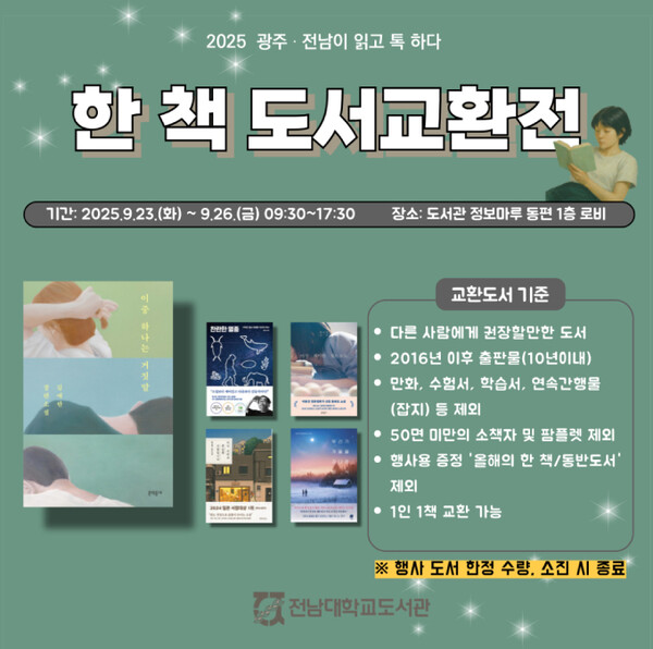 오는 23일부터 26일까지 4일간 우리 대학 정보마루(디도) 동문 1층에서 ‘2025 한 책 도서교환전’이 열린다. 도서교환전은 올해의 한 책 또는 동반 도서를 개인소장 도서와 교환하는 행사다. 우리 대학 구성원을 포함한 광주·전남 시도민이라면 누구나 이 행사에 참여할 수 있다.